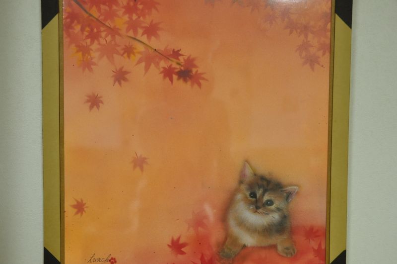 ねこ展のお知らせ 2011年7月6日2019年8月16日 投稿者: nekokaigi、カテゴリー: にゃんこ写真 本日より2週間、店内でhunchさんの絵画展を開催しております。 テーマは「子猫の春夏秋冬」で、それぞれの季節をイメージした 4作品を展示しております。 アクリル絵具と柔らかい感じを出すために和紙を使われているそうです。 出来るだけ背景等は描かず、無地をいかして 子猫の四季を表現していらっしゃるとのことでした。 本当に、とっても柔らかい色使いと雰囲気で、 ほんわかと優しい気持ちになれるような絵です! こちらは「秋」です。 よかったらご来店の際にご覧くださいね!