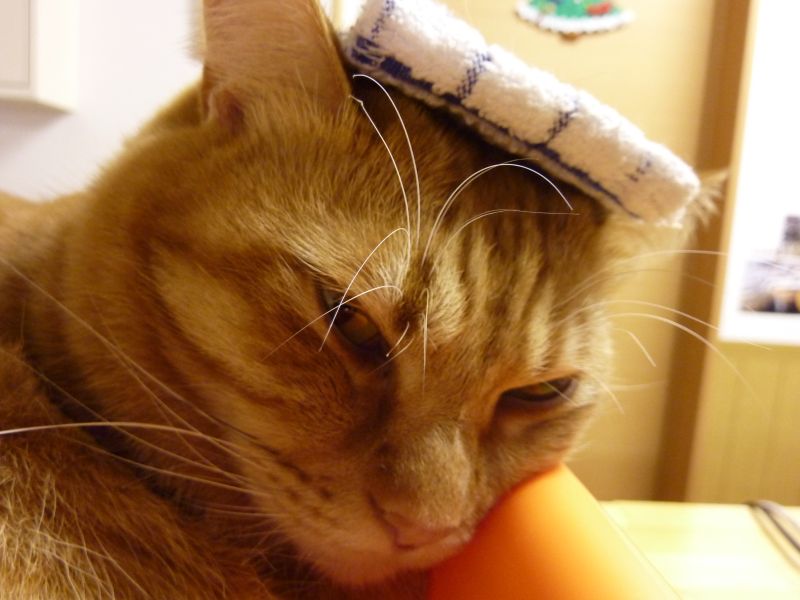 when we Japanese see the cat in a basket and the towel on the cat’s head,