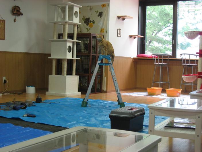 みるくさんが脚立の上に乗っていて、いかにもこれから仕事するかという雰囲気です。すももくんは高い所で業者の人に細かい指示を出していそうです。